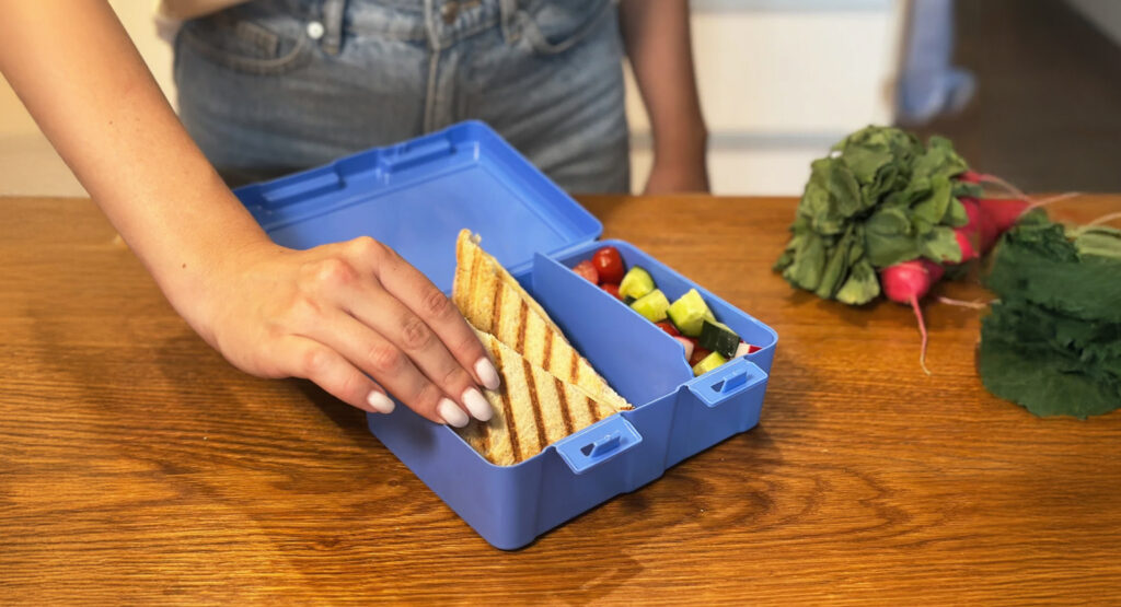Deti jedia očami – a platí to aj pri desiate. Použite farebnú krabičku s priehradkami, aby mali jednotlivé suroviny svoje miesto. Šunka, syr, zelenina či ovocie vyzerajú hneď lákavejšie, keď sú pekne rozdelené. A keď pridáte malé napichovátka alebo vykrajovačky na chlieb a syr, krabička sa premení na mini „bento box“. Zvedavosť zafunguje a desiata zrazu zmizne.